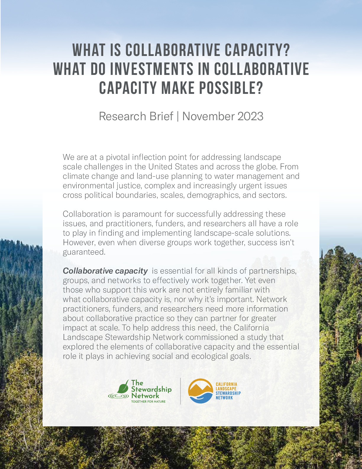Collaborative capacity is essential for all kinds of partnerships, groups, and networks to effectively work together. Yet even those who support this work are not entirely familiar with what collaborative capacity is, nor why it’s important. Network practitioners, funders, and researchers need more information about collaborative practice so they can partner for greater impact at scale. To help address this need, the California Landscape Stewardship Network commissioned a study that explored the elements of collaborative capacity and the essential role it plays in achieving social and ecological goals.
