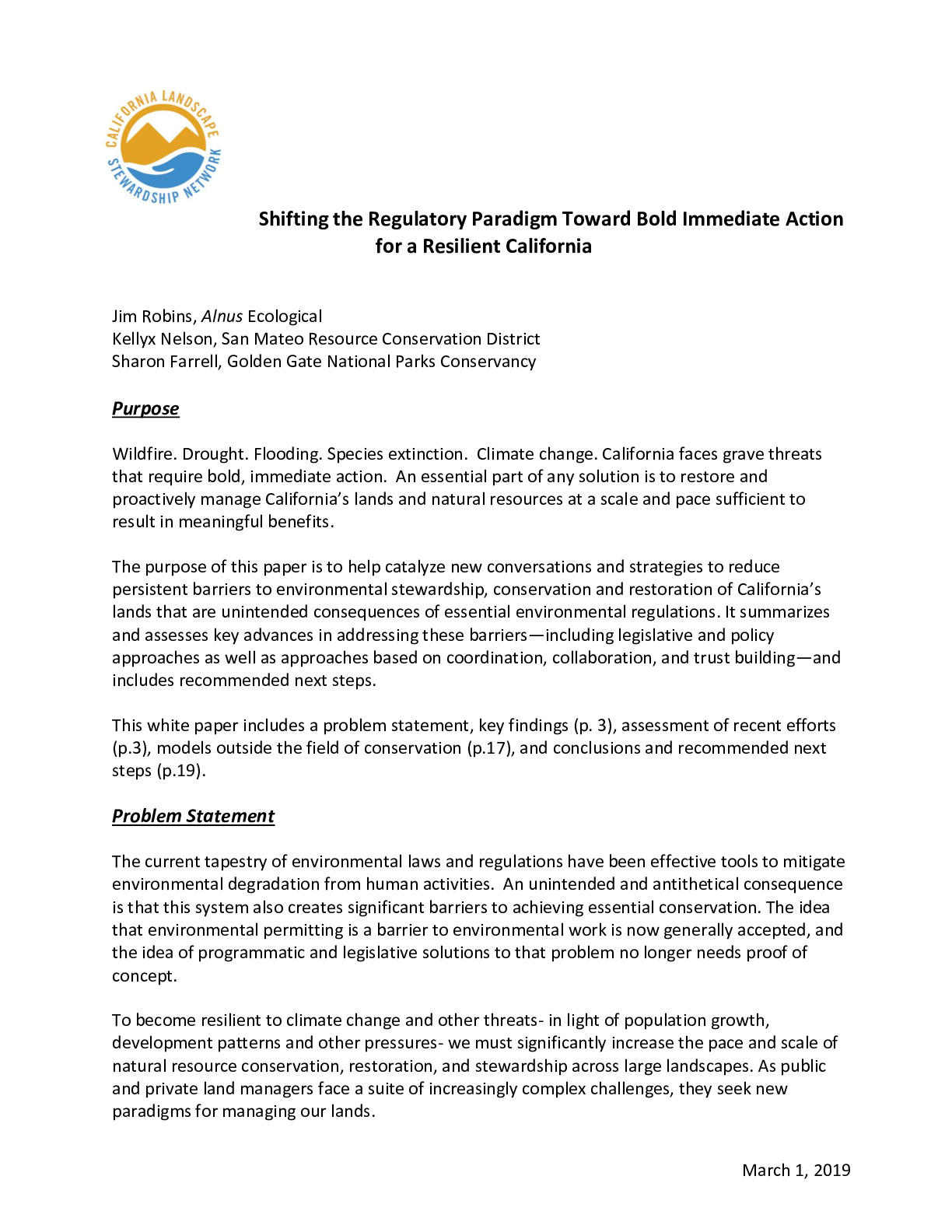 The purpose of this paper is to help catalyze new conversations and strategies to reduce persistent barriers to environmental stewardship, conservation and restoration of California’s lands that are unintended consequences of essential environmental regulations. It summarizes and assesses key advances in addressing these barriers—including legislative and policy approaches as well as approaches based on coordination, collaboration, and trust building—and includes recommended next steps.