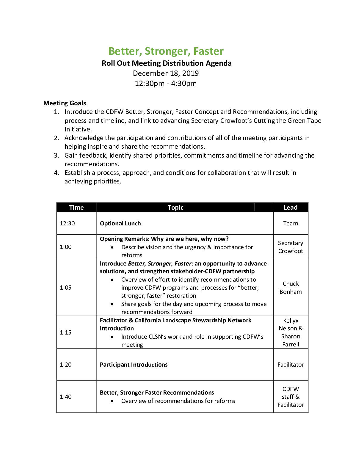 - Introduce the CDFW Better, Stronger, Faster Concept and Recommendations, including process and timeline, and link to advancing Secretary Crowfoot’s Cutting the Green Tape Initiative.